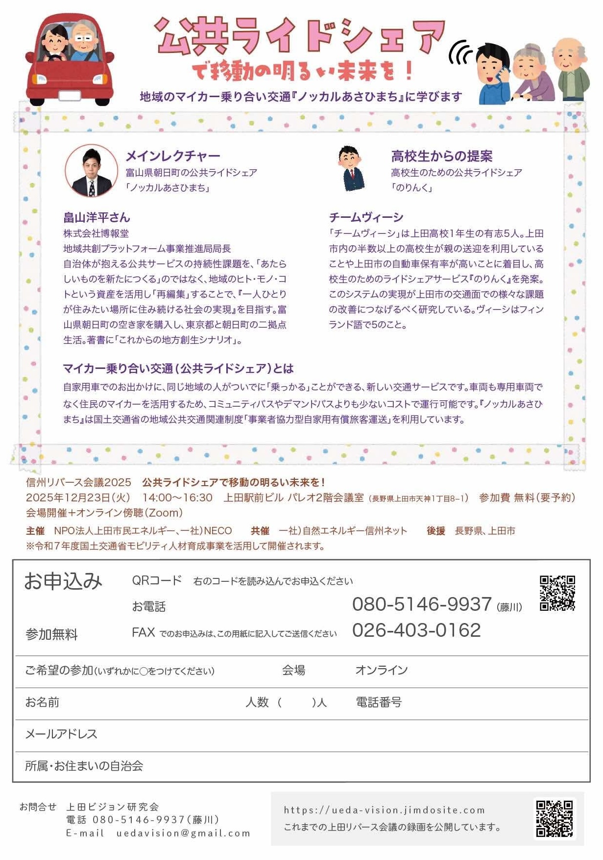 さらに、上田高校の生徒たちのアイディア、通学を支える公共ライドシェア「のりんく」も発表。世代と立場を超えて、地域交通の未来を一緒に考えてみませんか。